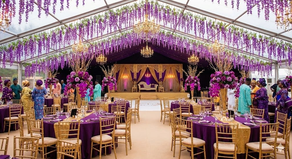 Prompt: Wedding reception layout in a large marquee, purple and gold theme, hanging wisteria flowers from the ceiling, golden chivalry chairs, Nigerian wedding vibe.