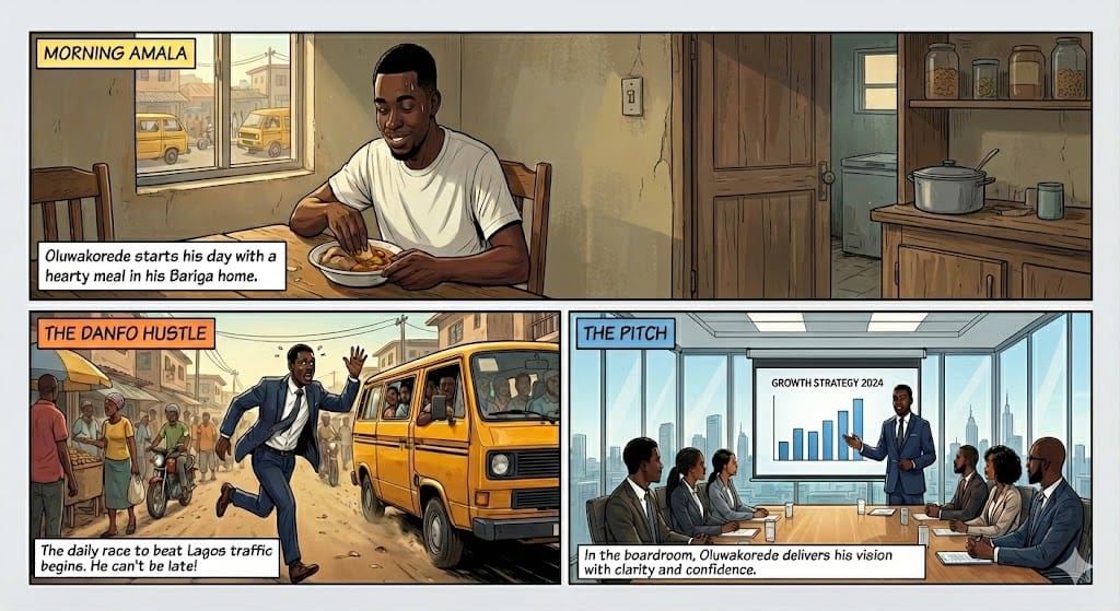 Prompt: Create a storyboard telling the story of Oluwakorede (reference attached images). There are three story panels, one of him eating Amala in the morning, another of him trying to catch a bus by his street in Bariga, and the third of him presenting a speech in a boardroom. His dressing across the last two panels is rather corporate.