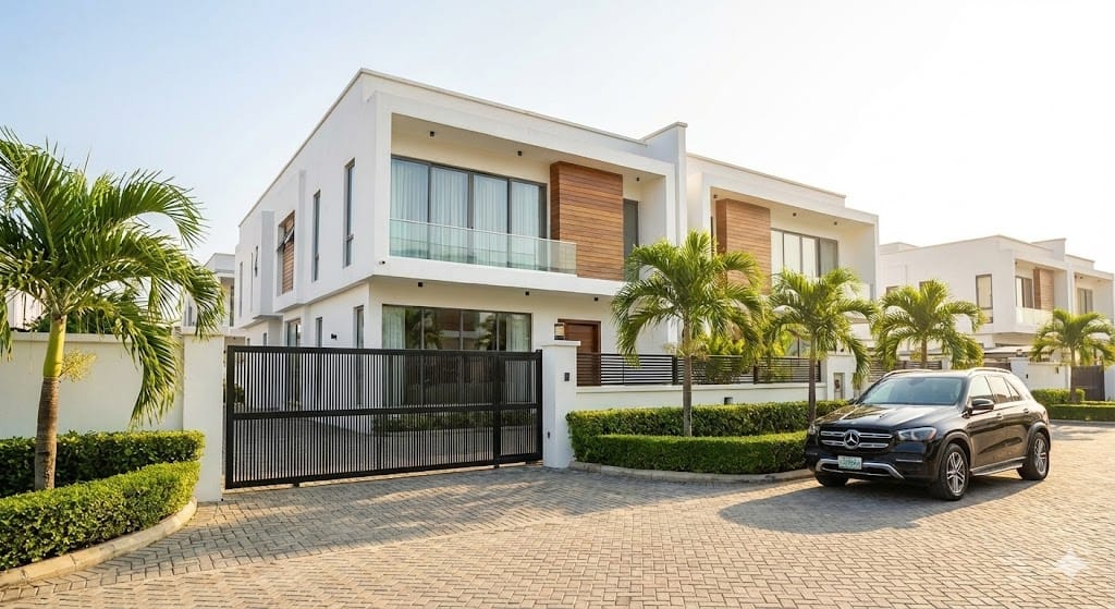 Prompt: Modern white duplex, Lekki style, sunny afternoon, black gate, interlocked floor.