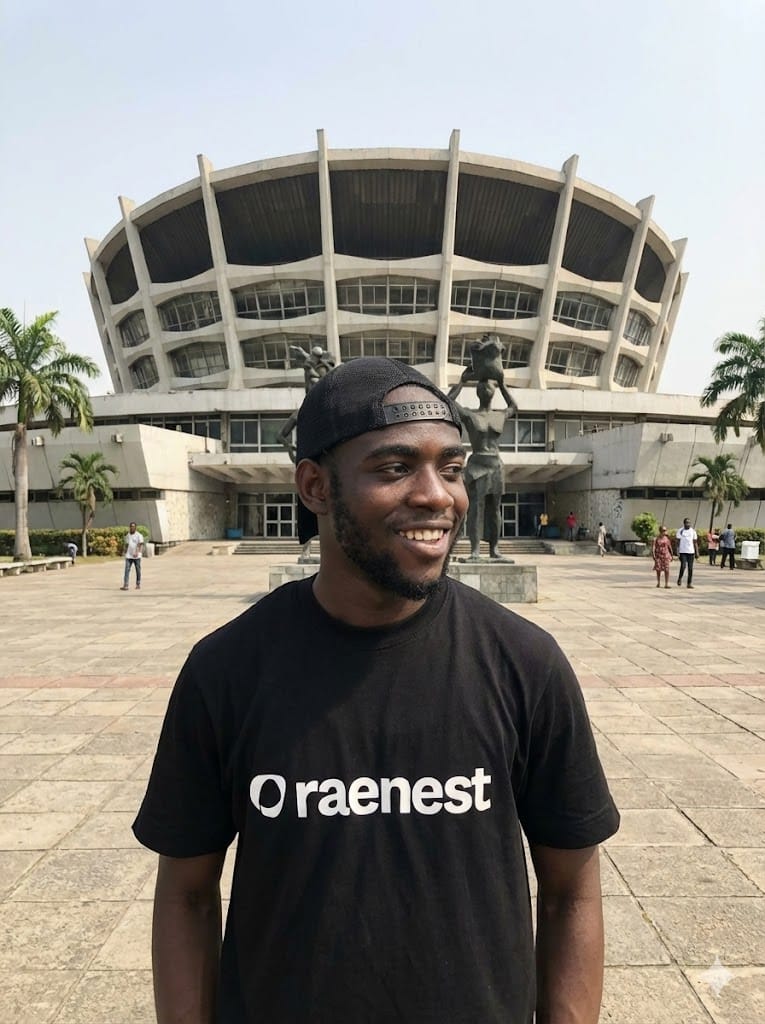 Prompt: Generate an image of the guy in the attached image standing in front of The National Theatre, Lagos.